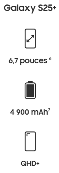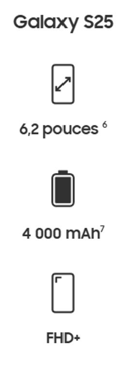 ![]() | Enveloppés dans un cadre en aluminium léger, les Galaxy S25 et S25+ sont conçus pour être emportés pratiquement partout.5 |