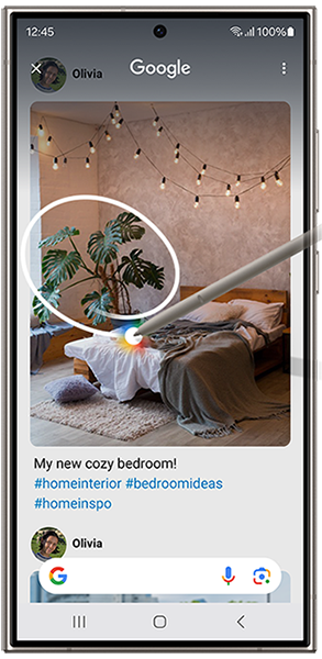 Entourez-le et trouvez-le en toute simplicitéAvec Circle to Search, découvrez une nouvelle façon de rechercher.1 Lorsque vous consultez votre réseau social préféré, utilisez votre S Pen ou votre doigt pour entourer quelque chose et obtenir des résultats de recherche Google.*Image simulée à des fins d’illustration. |