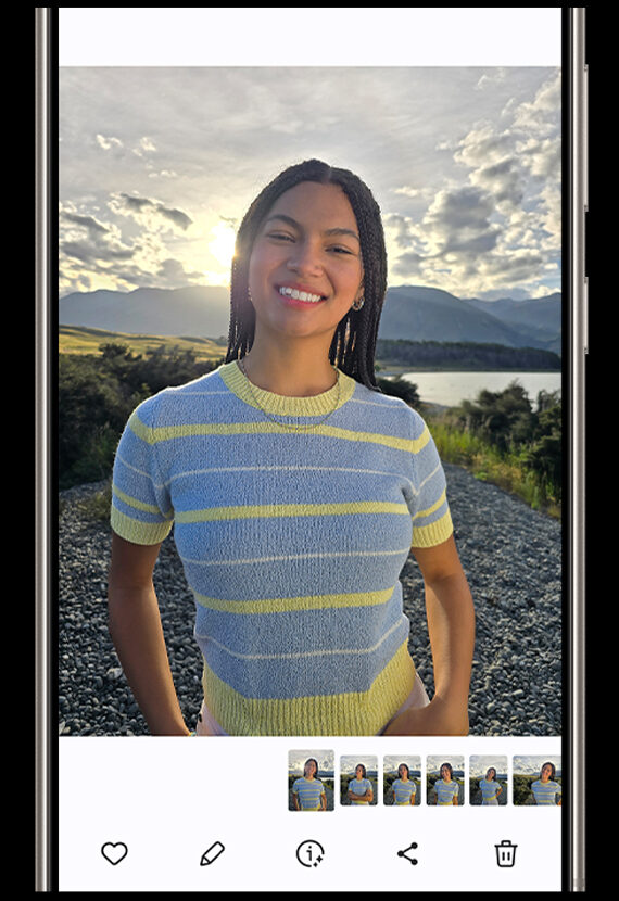 Edit Suggestion. Des retouches instantanées faites par l’IAPour une expérience de montage photo sans effort, utilisez Edit Suggestion avec AI.4 Prenez simplement une photo, puis ouvrez-la dans la Gallery. Les outils d’édition les mieux adaptés à l’occasion apparaîtront en bas de votre écran. *Image simulée à des fins d’illustration. |